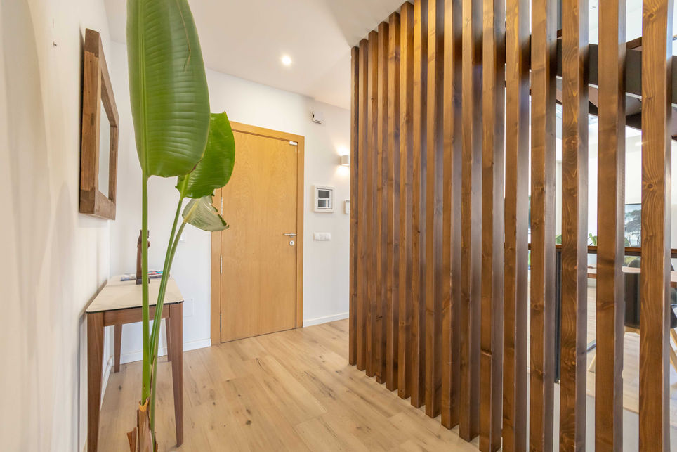 La planta superior alberga la suite principal con vestidor, baño privado y terraza panorámica, además de una zona lounge ideal como estudio o rincón de lectura. En el sótano se encuentra un garaje para cuatro coches con punto de carga eléctrico y una sala polivalente con luz natural, apta como gimnasio, despacho o sala de juegos.